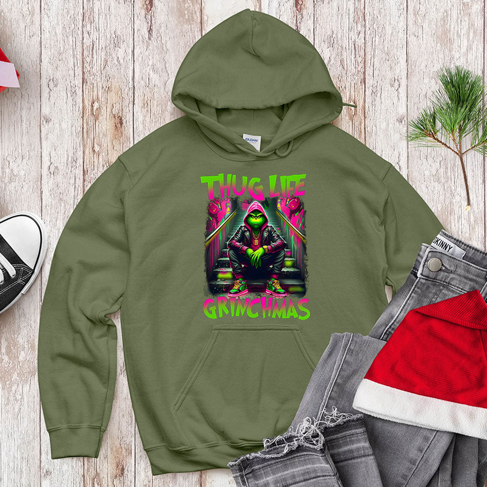 Ready to drop some serious style this holiday season? Our "Thug Life" Neon Mean Green Character T-Shirt, Sweatshirt, and Hoodie is here to bring a vibrant, urban edge to your festive wardrobe!