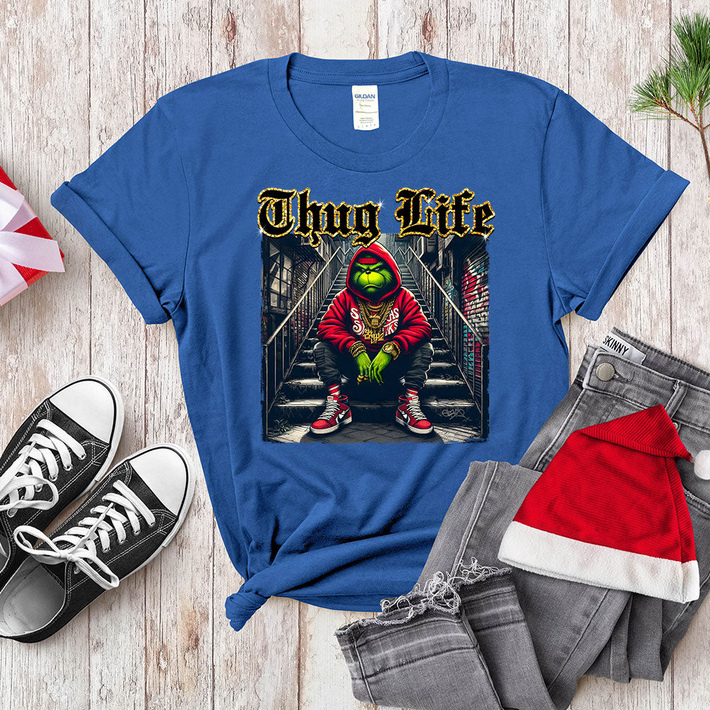 This exclusive design from Cusluckgift features the famous "Mean Green One"—the notorious holiday anti-hero—chilling on city steps, rocking a red hoodie, shades, and massive gold chains. With the bold "Thug Life" title, this is the perfect mashup of anti-holiday attitude and classic urban edge. It’s guaranteed to be the freshest look at any Christmas party!