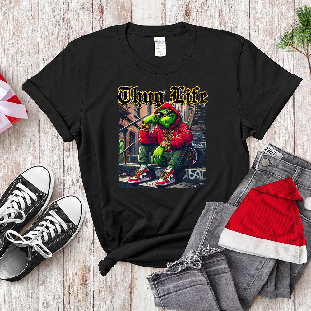 This exclusive design from Cusluckgift features the famous "Mean Green One"—the notorious holiday anti-hero—chilling on city steps, rocking a red hoodie, shades, and massive gold chains. With the bold "Thug Life" title, this is the perfect mashup of anti-holiday attitude and classic urban edge. It’s guaranteed to be the freshest look at any Christmas party!